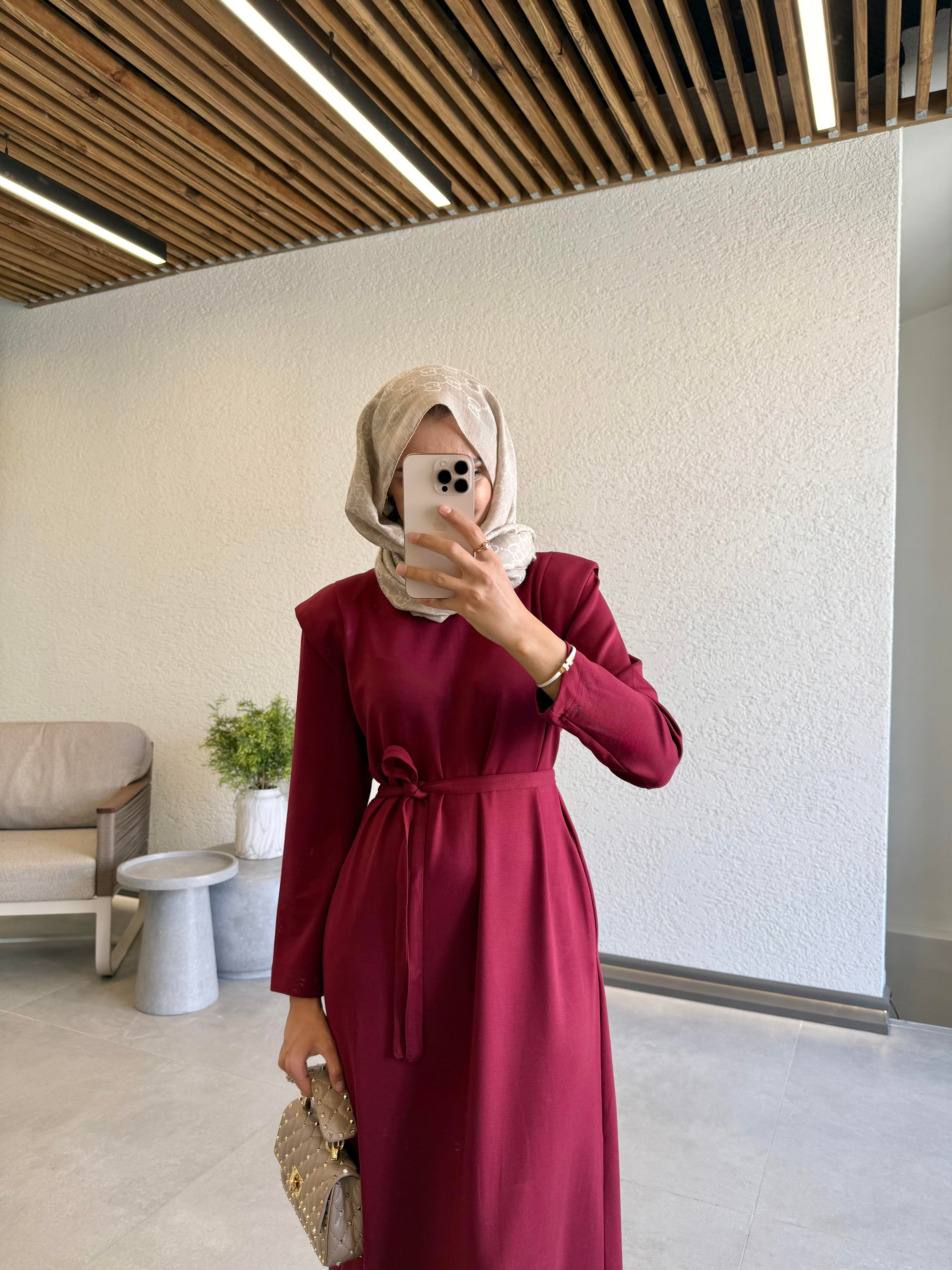 Aller Omuz Vatkalı Pamuk Elbise - Bordo