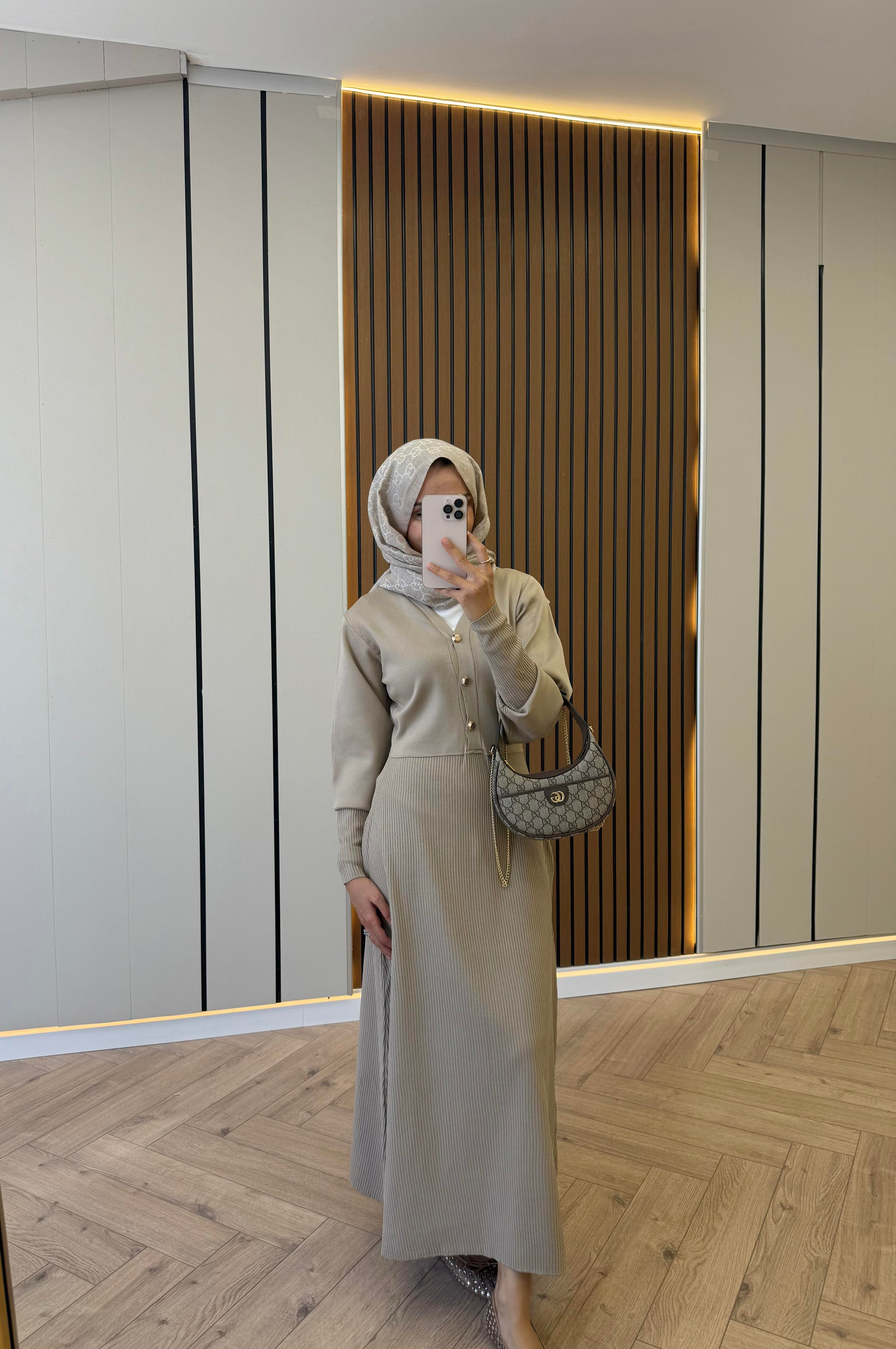 Gold Düğmeli Triko Elbise Bej