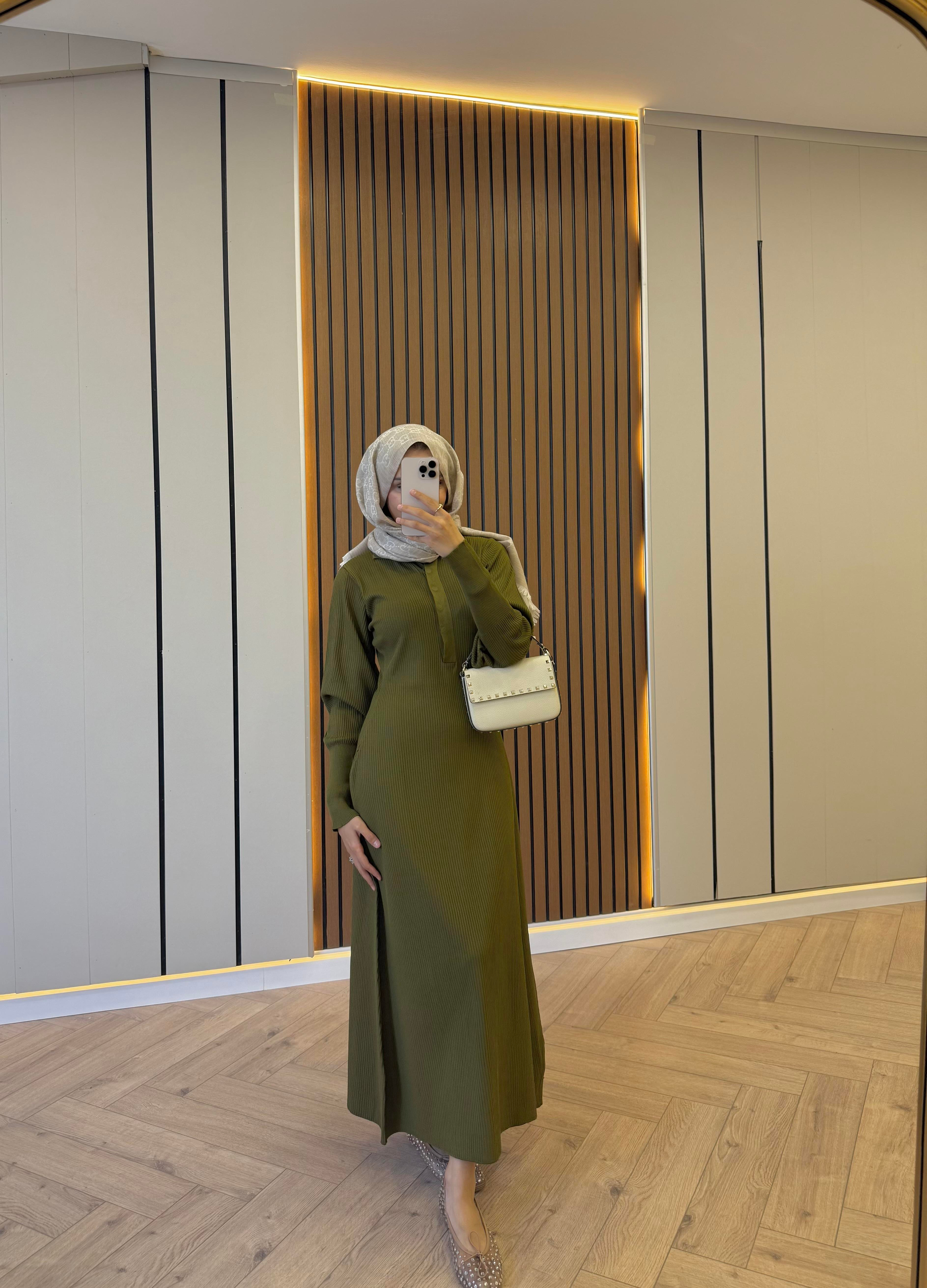 Mayla Dikey Çizgili Triko Elbise Yeşil
