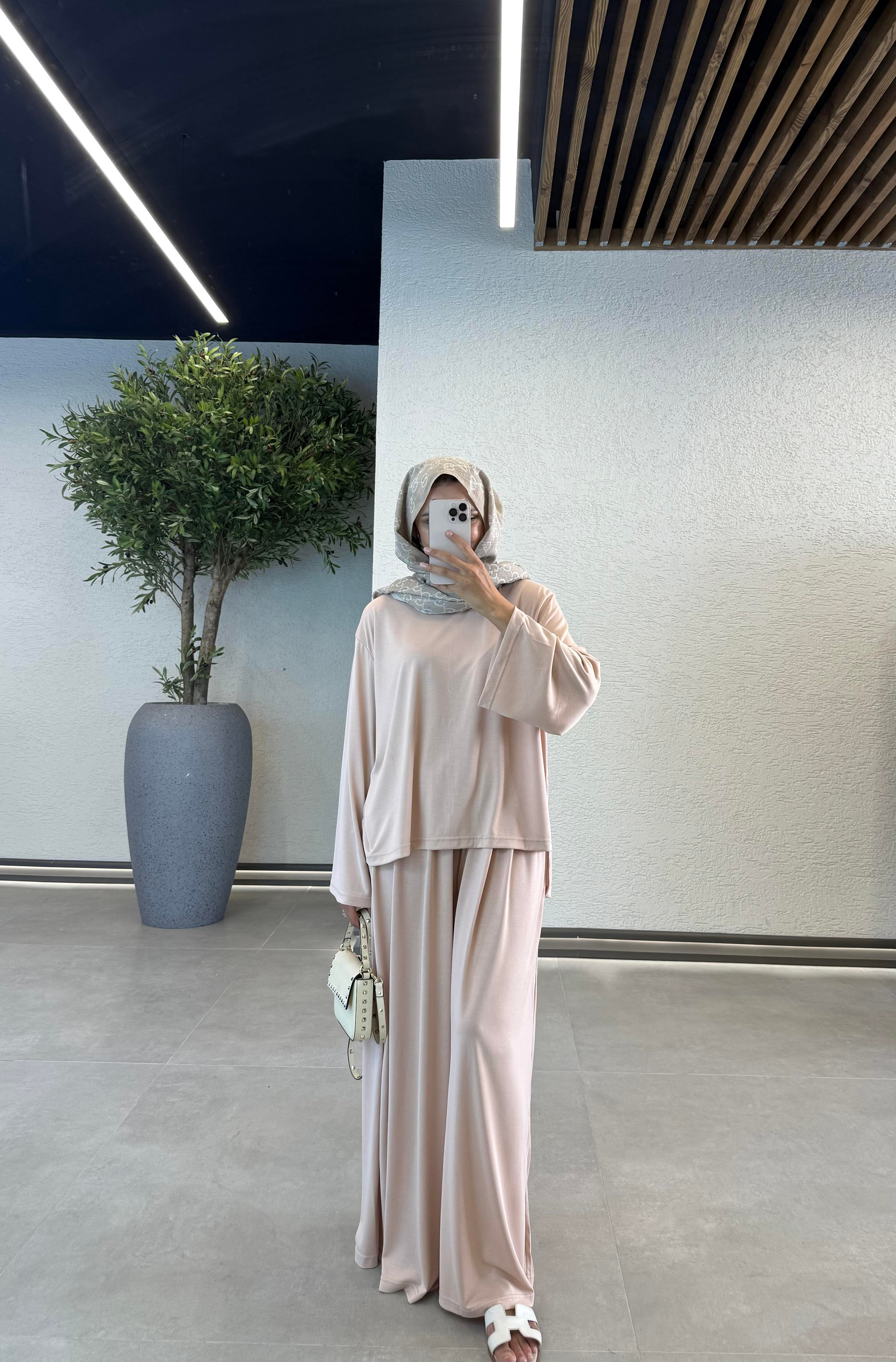 BISIKLET YAKA, İSPANYOL KOL, DÜŞÜK OMUZ, ÖNÜ KISA ARKASI UZUN FORMA SAHIP, PANTOLON BELI LASTIKLI, IÇERDEN TÜNELLI BAĞLAMALI AYARLANABILIR, BOL PAÇA, RAHAT KALIP, MODAL IÇEREN PANTOLON TAKIM.
