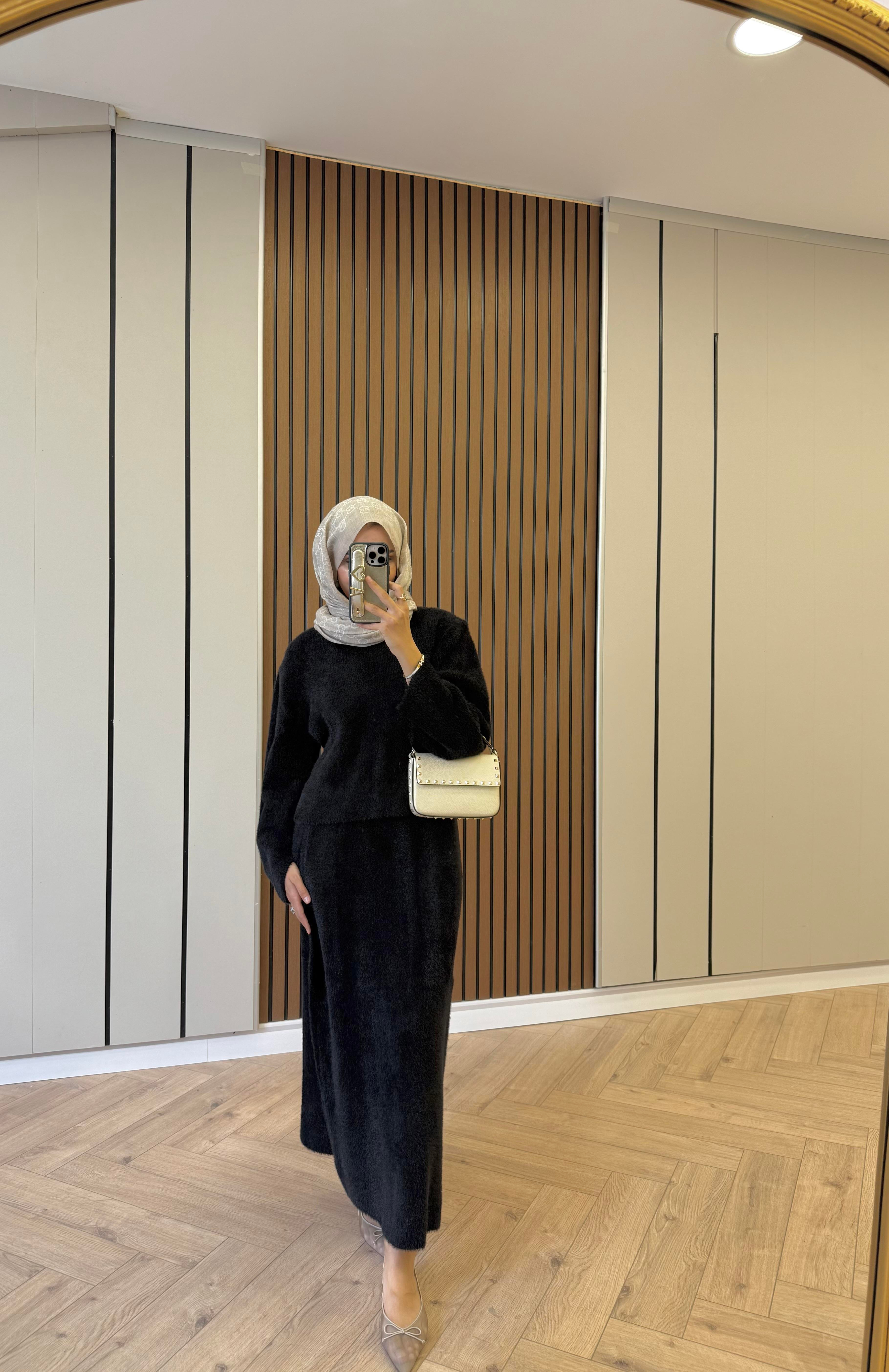 Peluş Tüylü Etekli Takım Siyah