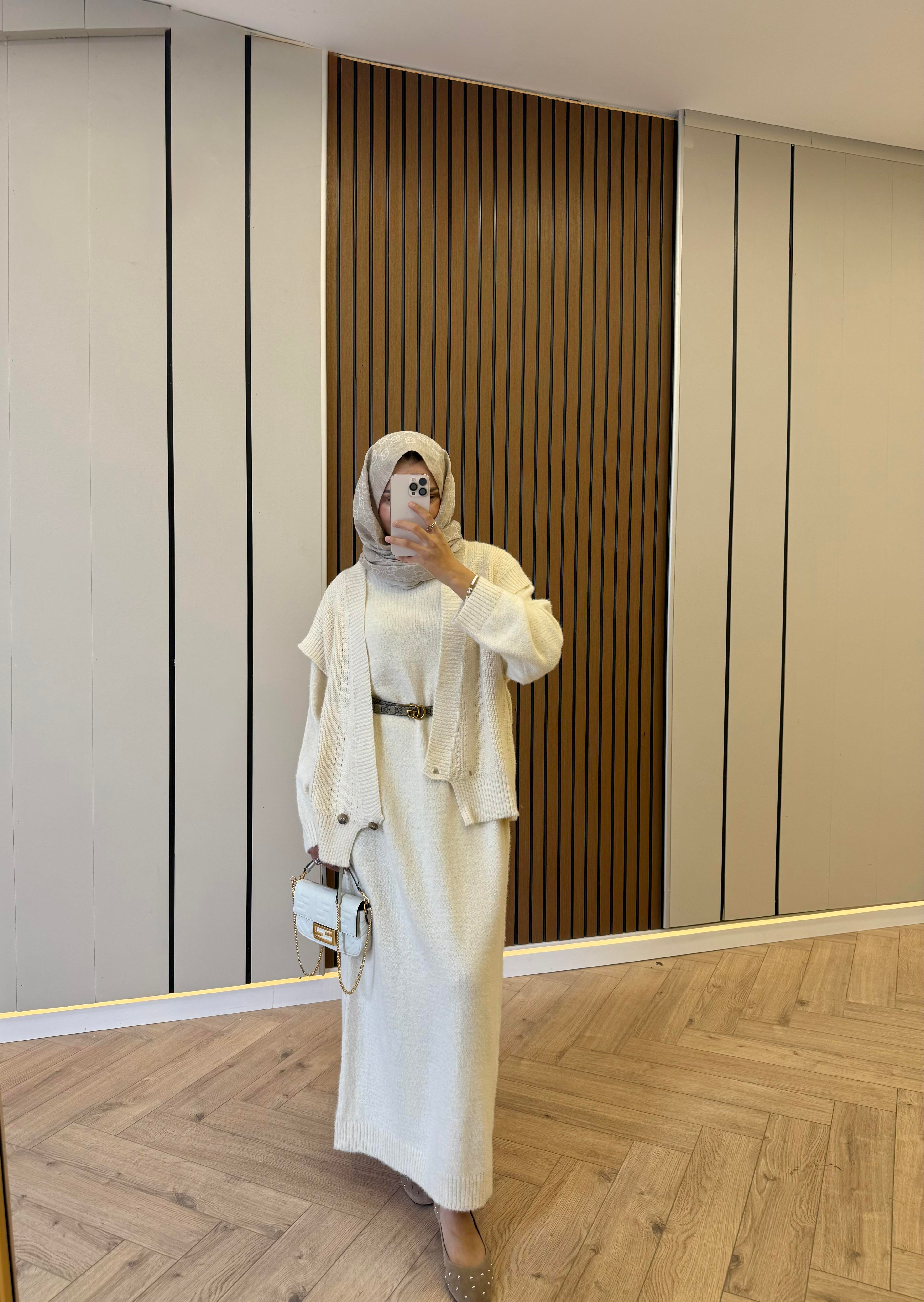 Süveter Detaylı Dokulu Triko Elbise-Krem